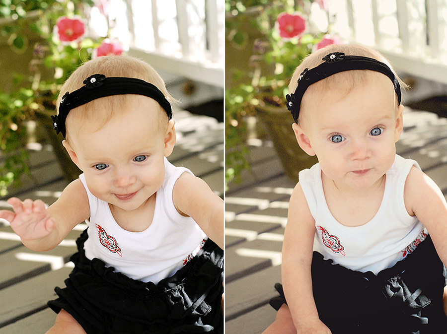 I'm not sure what happened - but I went overboard this month. Waaaaaaayyyyy too many pictures! Wynne is sitting up so well that I can plop her anywhere and take a picture now, which would be great if she would stay still long enough! And I just can't get enough of that crooked grin, complete with two bottom teeth! Love it!!! I set up the trusty ol' tripod again so I could have a few shots with her myself, which turned out to be quite tricky when you have a baby that fusses at that annoying beeping sound. Oh, and please note my favorite - the huge cowlick on the side of her head that she dawned after her nap! It was too adorable to fix. :) She's getting so many expressions and perfecting the technique of baby babble that I edited nearly every picture I snapped that day. I need to get a grip. Who armed me with a camera?